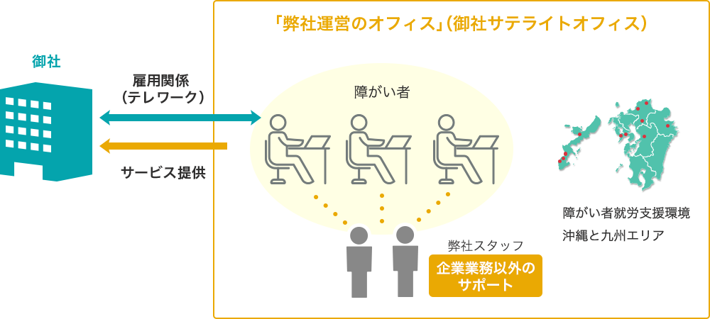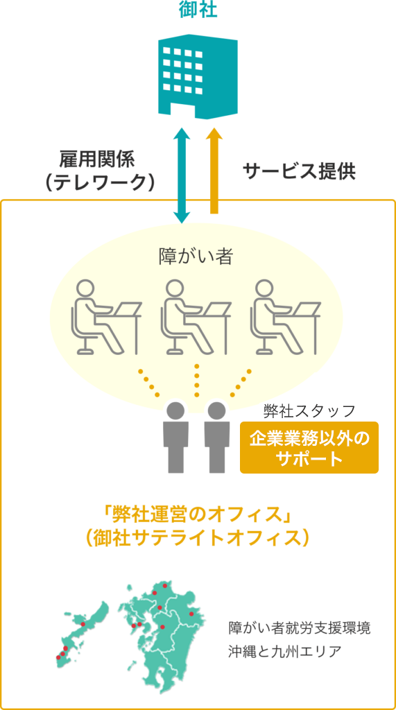 - 法定雇用を満たせない「サテラボ」なら、企業様の負担を軽減する管理業務の支援や、人員調整まで幅広く対応します。